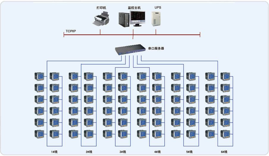 該電力監控系統應實現各配電室各饋線回路電壓、電流、功率、功率因數及頻率等監測信息實時刷新,配電室整體一次圖形式直觀動態顯示;完成對各配電回路的電壓、電流或功率實時和歷史趨勢曲線的繪制,便于分析該回路配電運行工況;完成對各回路的電能集抄功能,并自動生成符合客戶管理需求的用電報表,所有報表或圖表支持查詢打印功能;對各監測點的通訊狀態或異常用電進行報警,便于管理人員實時掌握并分析配電運行情況。